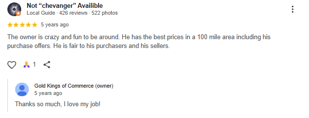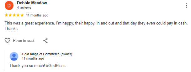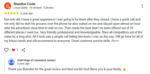 Not only did I have a great experience I was going to be there after they closed. I have a quick call and not only did he start his process over the phone he also waited on me and stayed open almost an hour after his advertised close time to wait on me. Then made the best deal I’ve been offered out of 30 different places I went too. Very friendly professional and knowledgeable. Blew all competitors out of the water by a long shot. All it took was a simple call letting him know I was on the way. Will go here for all of my future needs and will recommend to everyone. Great customer service skills. A+++